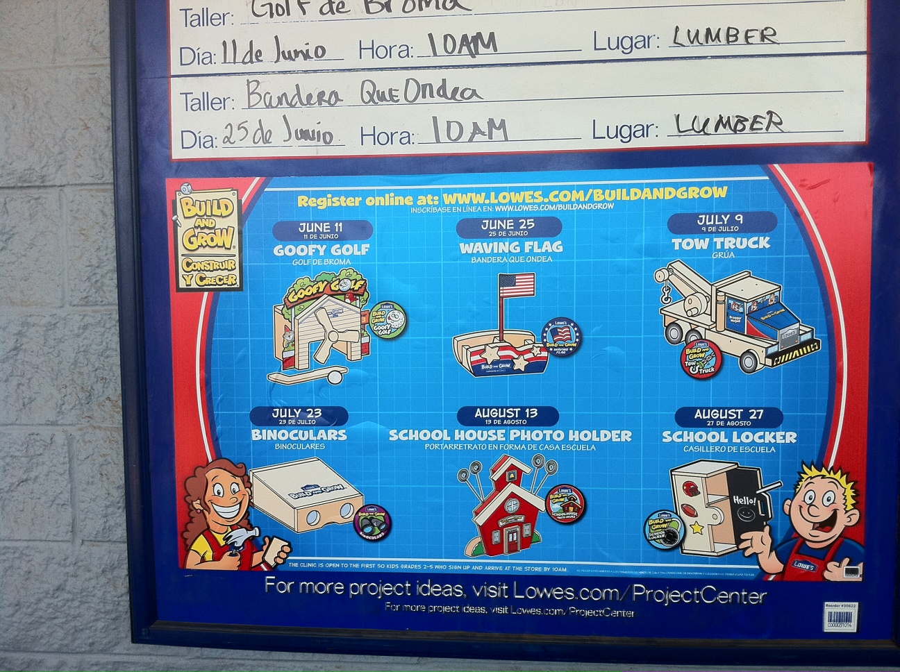 About a year ago my friend Brent told me about the “Build and Grow” program that Lowe’s sponsors. Well my curiosity once again got the best of me. My plan at first was to just take my oldest son Blake. However, once Brayden saw the hammers for the first time I knew this would be a family affair. And so it is, but a great one at that. So far we have built a pin ball machine, a birdhouse, a special mom’s day vase and the bi-plane in the picture. A couple of points of advice for anyone planning on building with their children. First off read the instructions and look at the pictures. Just because it looks simple does not mean it’s easy. Trust me I’ve seen plenty of parents screw it up. Oh wait that was me! Second thing, your kids will get distracted when swinging the hammer, make sure your thumbs and fingers are prepared.