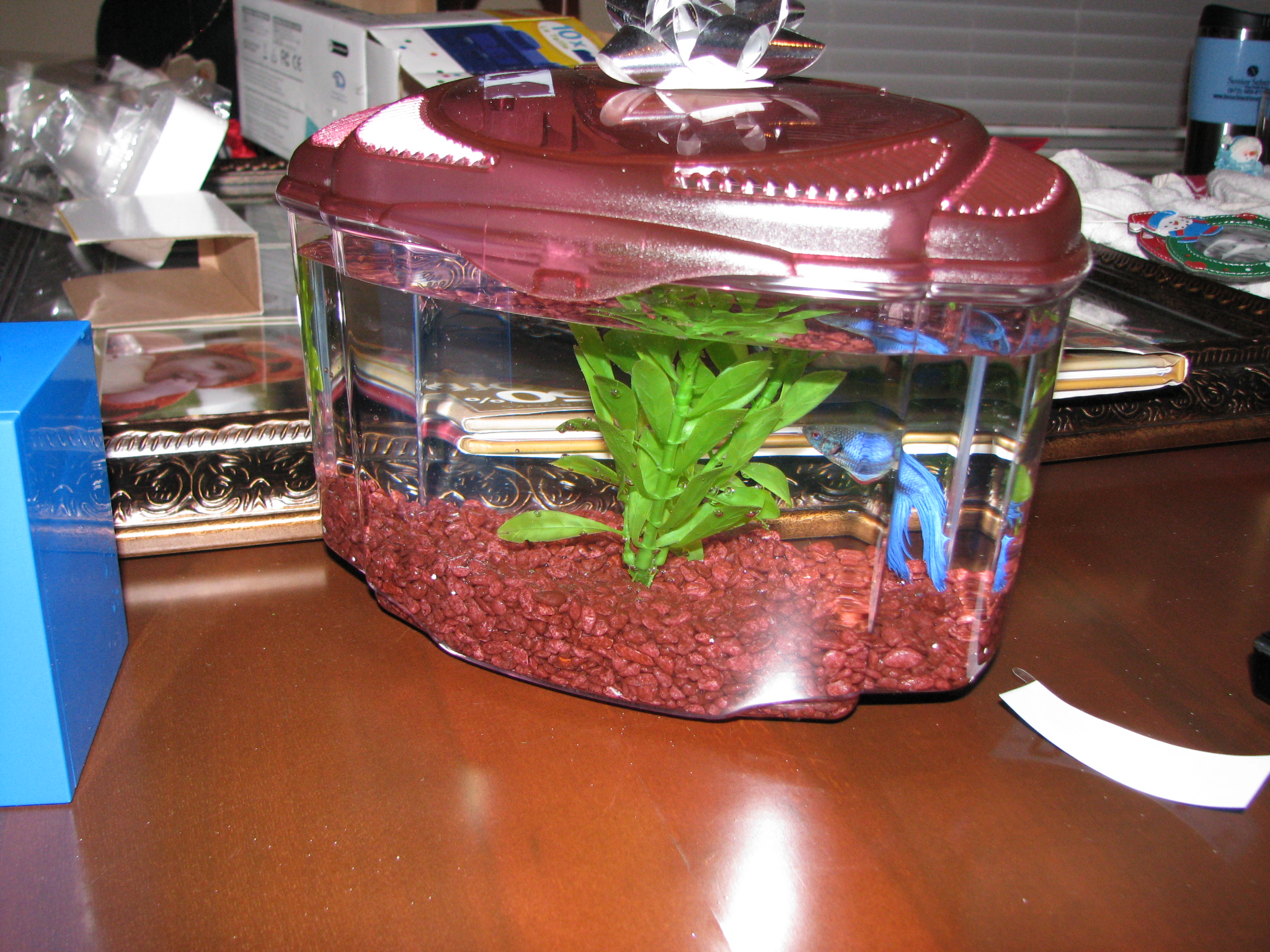 Our newest family member was delivered by Santa Claus on Christmas Eve. His name is Dorothy, a blue Beta Fish. That’s right Dorothy. Blake named him after the pet fish of a certain red fuzzy creature on Sesame Street. I wanted to name him Chum!